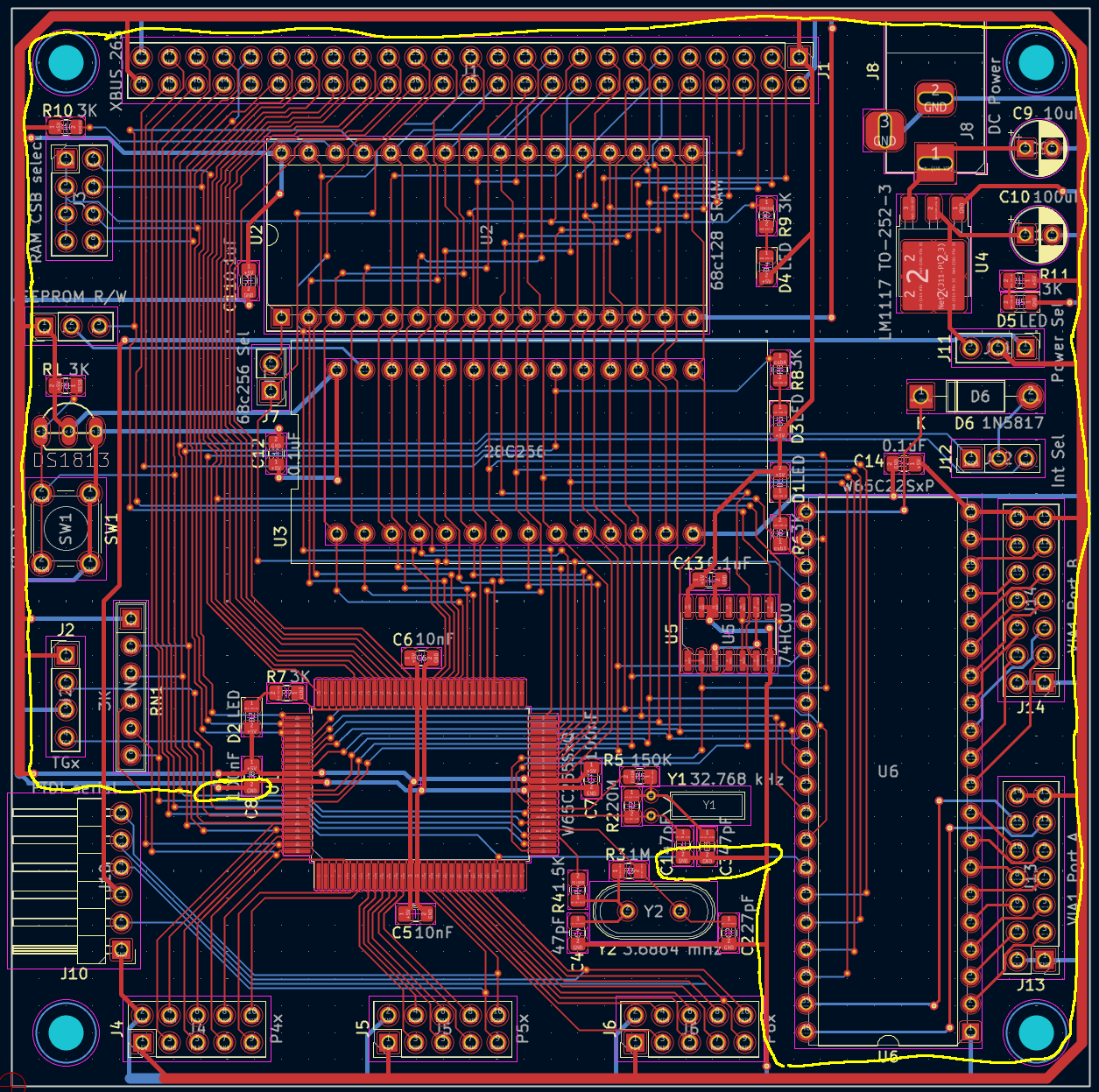 I'm looking at the ground used for C1 and C3, the caps on your 32kHz crystal. In order to connect to the ground that the processor is using, is it true that the trace goes down towards the south edge of the board and then all the way east to that corner, then all the way north to that corner (where it meets up with the power supply connector), then all the way west to that corner, and then finally halfway south before it comes over to the processor?