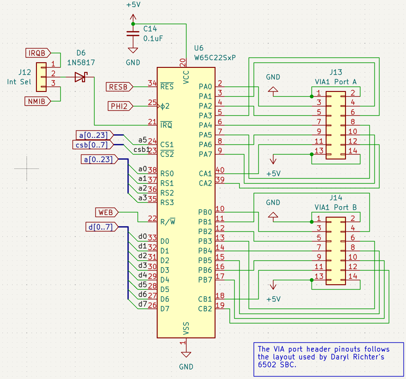 My first thought was that I messed up the bus connections. So, I looked at the 65c22's pinout and validated the data and address lines. I then verified the phi2 was correct and that WEB was connected to the RWB pin. I also compared it to other 6502 SBC schematics that I know work and the WDC Mench computer schematic. It all looks reasonable.