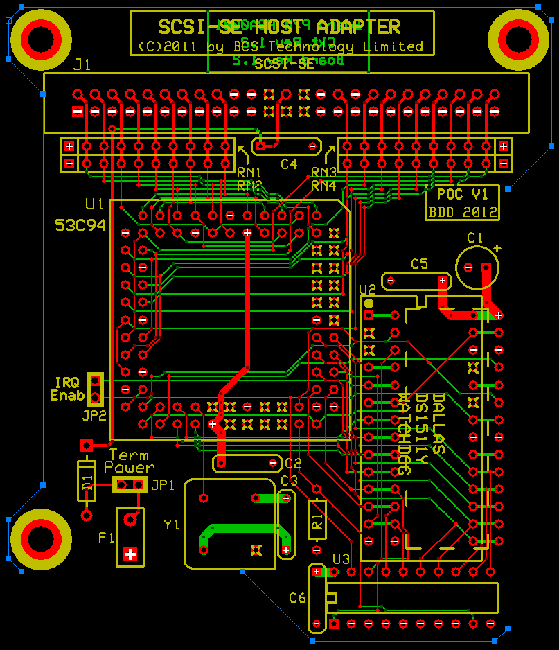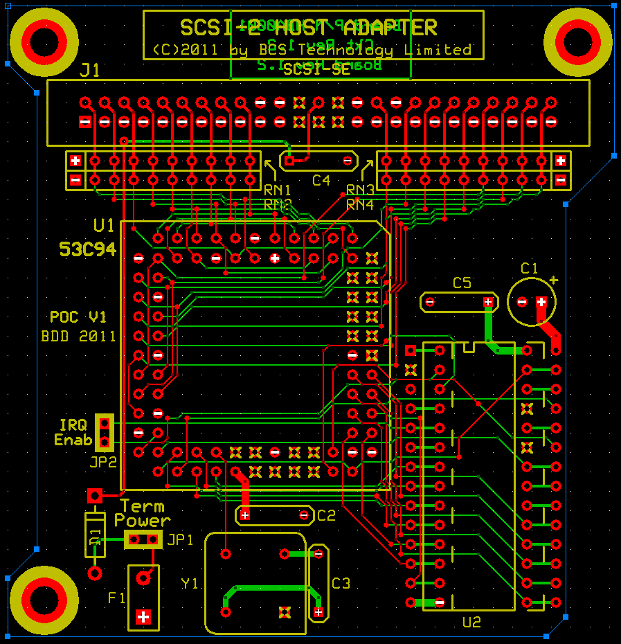 Here also are the schematic and printed circuit board layout for the SCSI host adapter (HBA). The HBA piggy-backs on the POC and plugs in to socket J8, and the Dallas watchdog timer plugs into U2 on the HBA. This PCB version incorporates the patches I made to extend the /DACK input of the 53C94 to the POC for DMA port access.