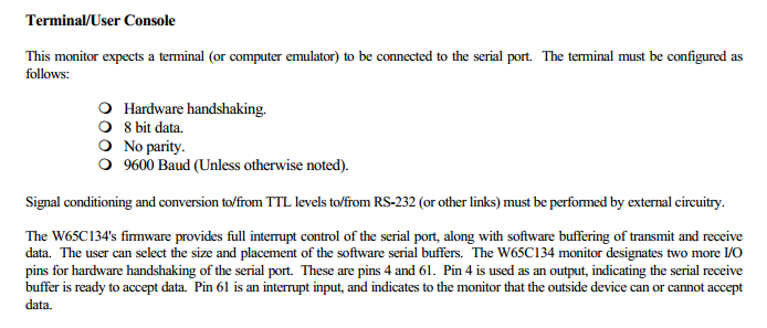 While reading the W65C134S Monitor ROM Reference Manual, Release 2.0 (February 7, 1995), I noticed that the serial routines use hardware hand shaking. Does anyone know if I can bypass the input signal from the PC host by tying the NE47 line (pin 61) on the W65C134S to ground?