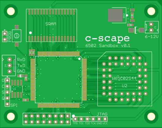 Inspired by enso's 6502 playground, I decided to make something similar myself. The attached pictures are for the first prototype, which has a Spartan-6 FPGA, a 6502 or 65816 in PLCC socket, and an 128kB SRAM device. For I/O there's a simple LED, a UART, and a 16 pin header. Just like in enso's project, all 6502 signals are fed into the FPGA, which sits between the 6502 and the rest of the world. This version is just a prototype to test the concept. I'm planning to make a second version on a slightly bigger board with some more interesting I/O capabilities, such as video, audio and USB. I'm using a SPI serial flash for the FPGA configuration, with the serial pins also brought out to a header. This should allow update of the FPGA contents for people without access to JTAG pods.