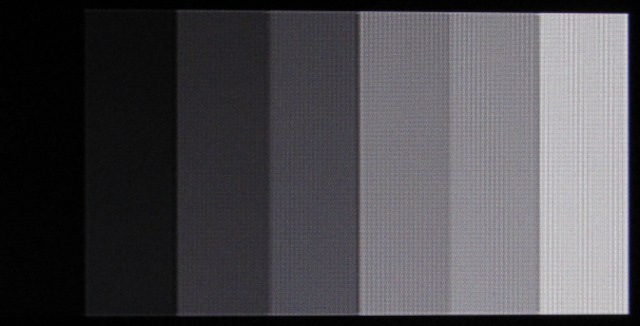 Here's a test with grayscale bars. And the signal on the scope: As you can see, the steps aren't spaced evenly. I just used a 330 Ohm, 680 Ohm and 1.2k resistor (all 5%), and tried different combinations of '0', '1' and 'Z' outputs to get a few usable levels between 0.3V (black) and 1.0V (white), as well as 0V for sync.