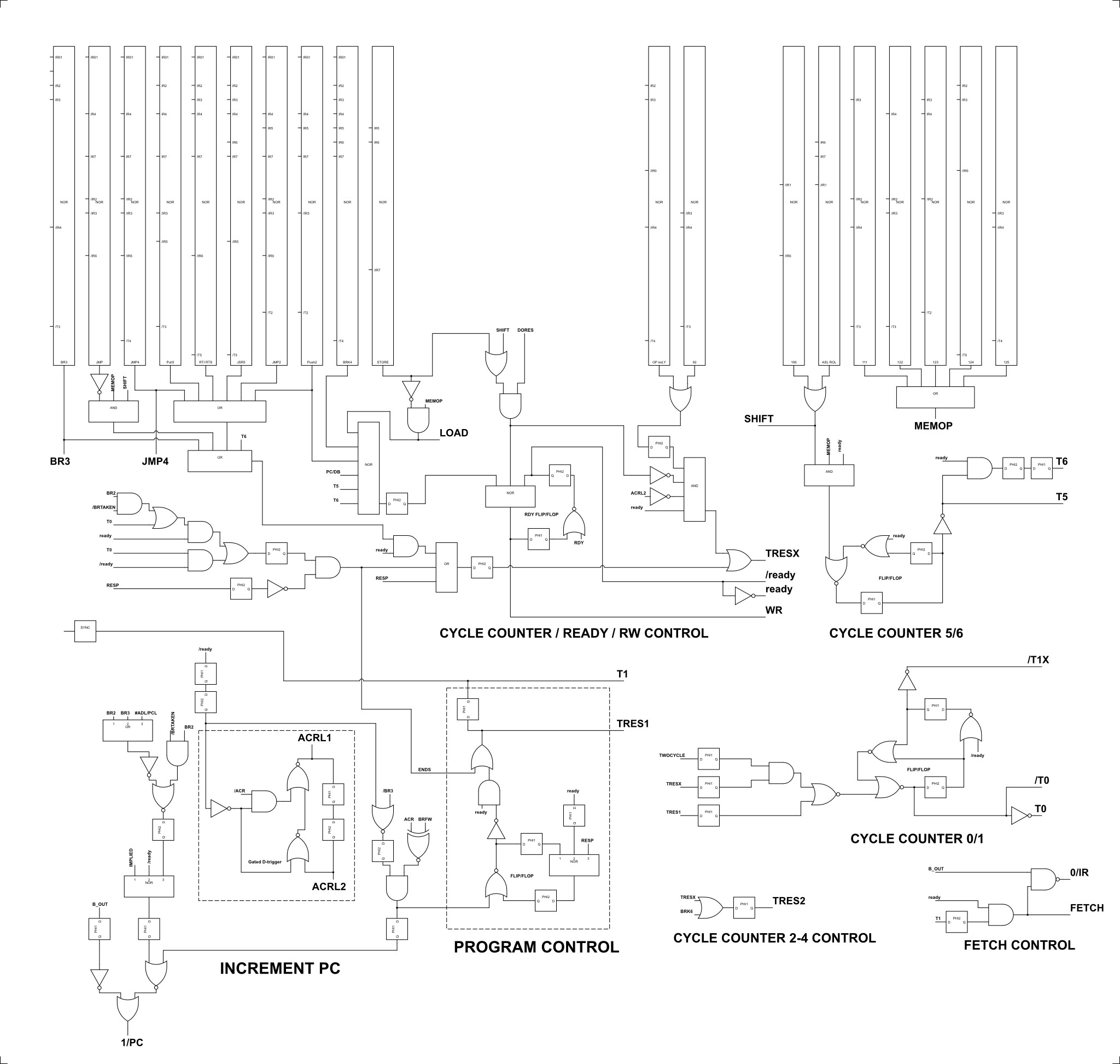What are the long rectangles at the top feeding in to the circuits at the bottom? For example, the two on the left labeled BRK2 and JSR3. And what are the IR1, IR7, etc. labels and marking on these bars?