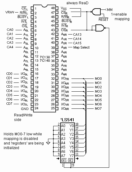 There are two short-comings, for my purposes, with the 74LS170 solution: First, because it has only 4 sets of registers, I'd have to treat the VIC's eight 8K BLocKs as four 16K "segments." That in itself isn't so bad, except I'm not sure there wouldn't be complications regarding BLK0, parts of which are shared with the Video Controller. Second, because the '170/'670 contains only 4 registers, I'd have only one Map. Having 16 registers, the 74LS612 would give me two sets of maps, selectable by simply changing one bit on the Mapping side.