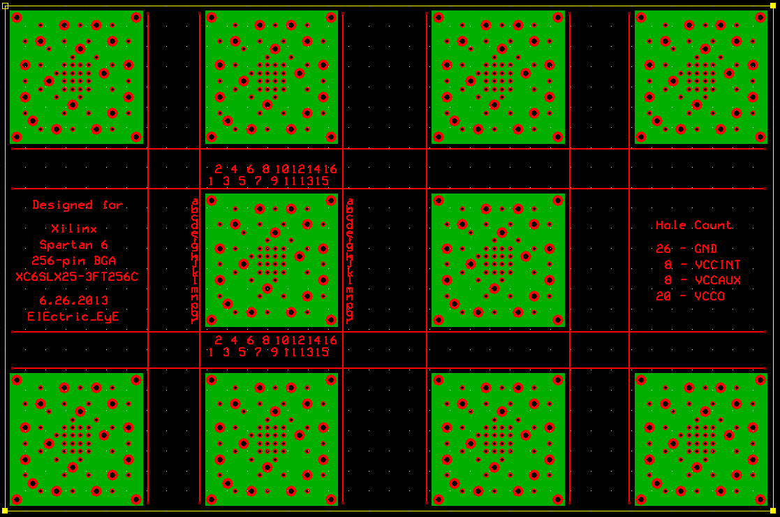 So I am eager to start production of my 3D bypass capacitor board, each .67"x.67" board will have 62 holes. Each of those holes will be a .056" via with a .029" hole. The 0605 caps will be a snug fit, since they are .065"x.032". Some things I have to consider are the number of holes per board. Max is 650 for ExpressPCB ProtoPro 2 layer service, the one that can't exceed 21sq". Which real estate is not the issue here, number of max hole is the limiting factor. So I can have multiple bypass cap boards on a single manufactured board. Looks like about 10. I will use extra holes remaing to make separation easier. $166 will get me 4x10 boards. I have to get the measurements correct the first time! I may have to go with the .065" via with the .035" hole.