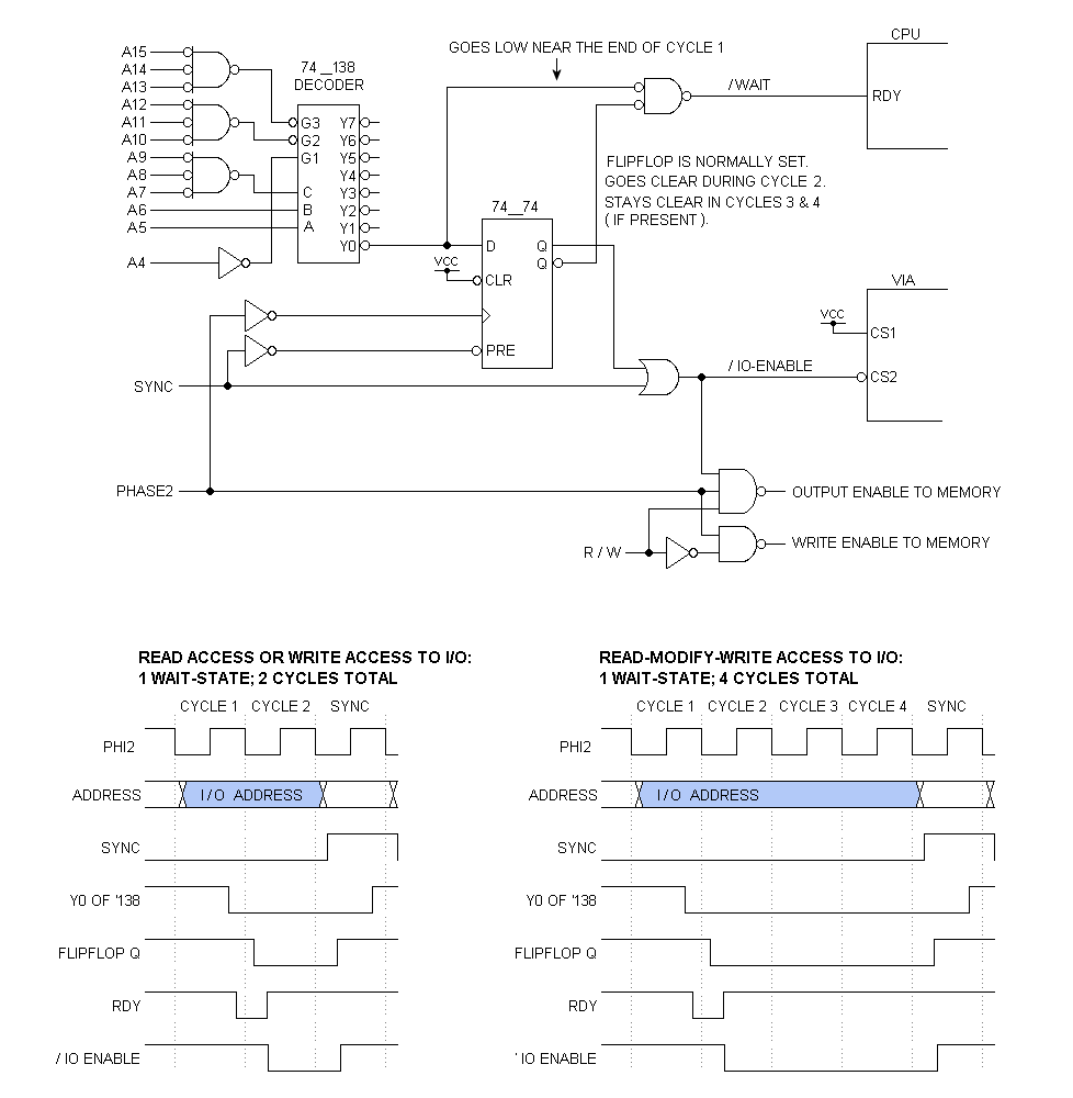 The circuit above includes wait state logic and full decoding for a 6522 VIA mapped into zero page. Read-Modify-Write instructions incur only one wait state, not three. This preserves the substantial performance advantage offered by SMB and RMB -- instructions custom tailored for fast I/O! The more general R-M-W instructions such as INC DEC TSB and TRB also incur only one wait state, as do simple reads and writes such as BIT LDA STA AND ORA etc.