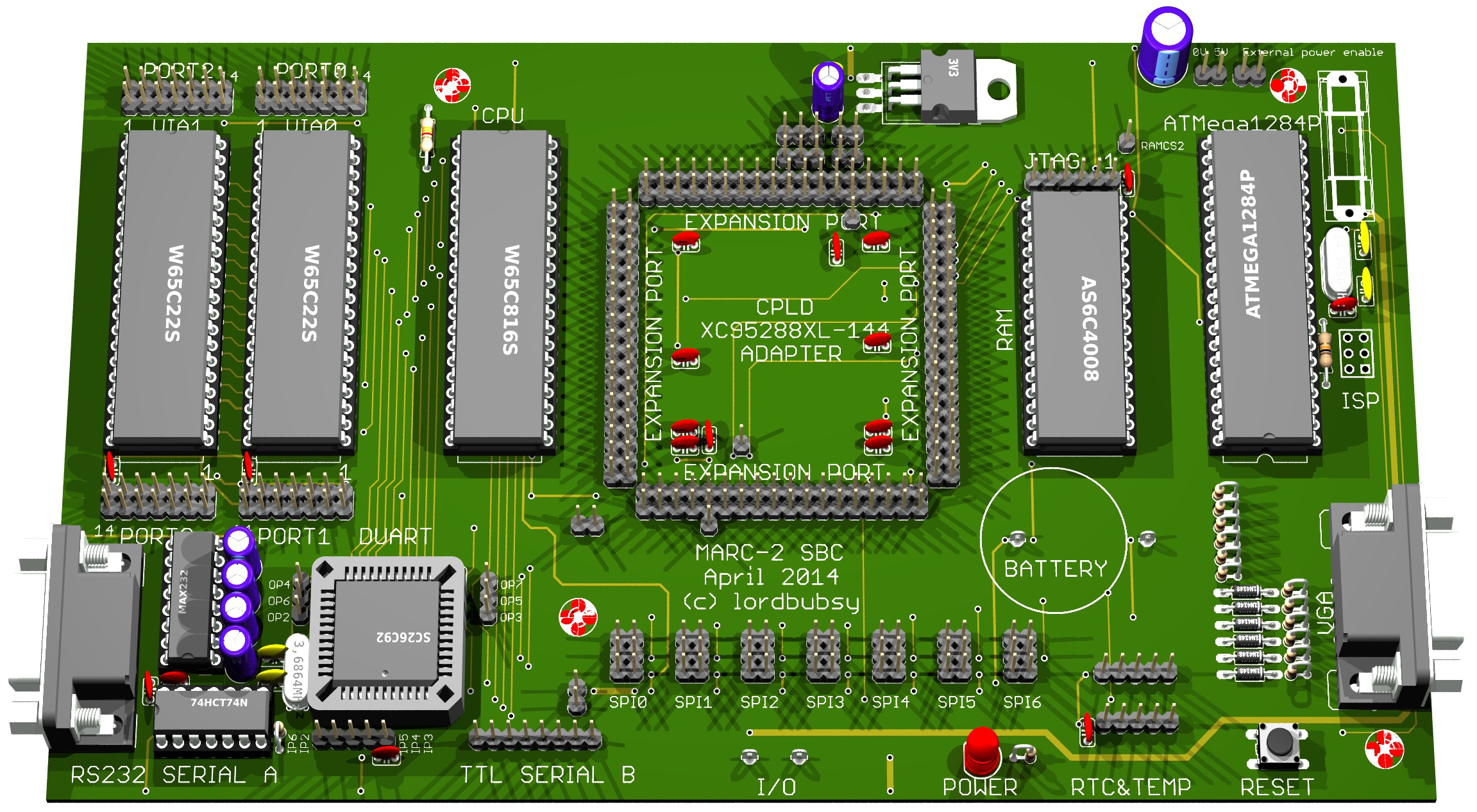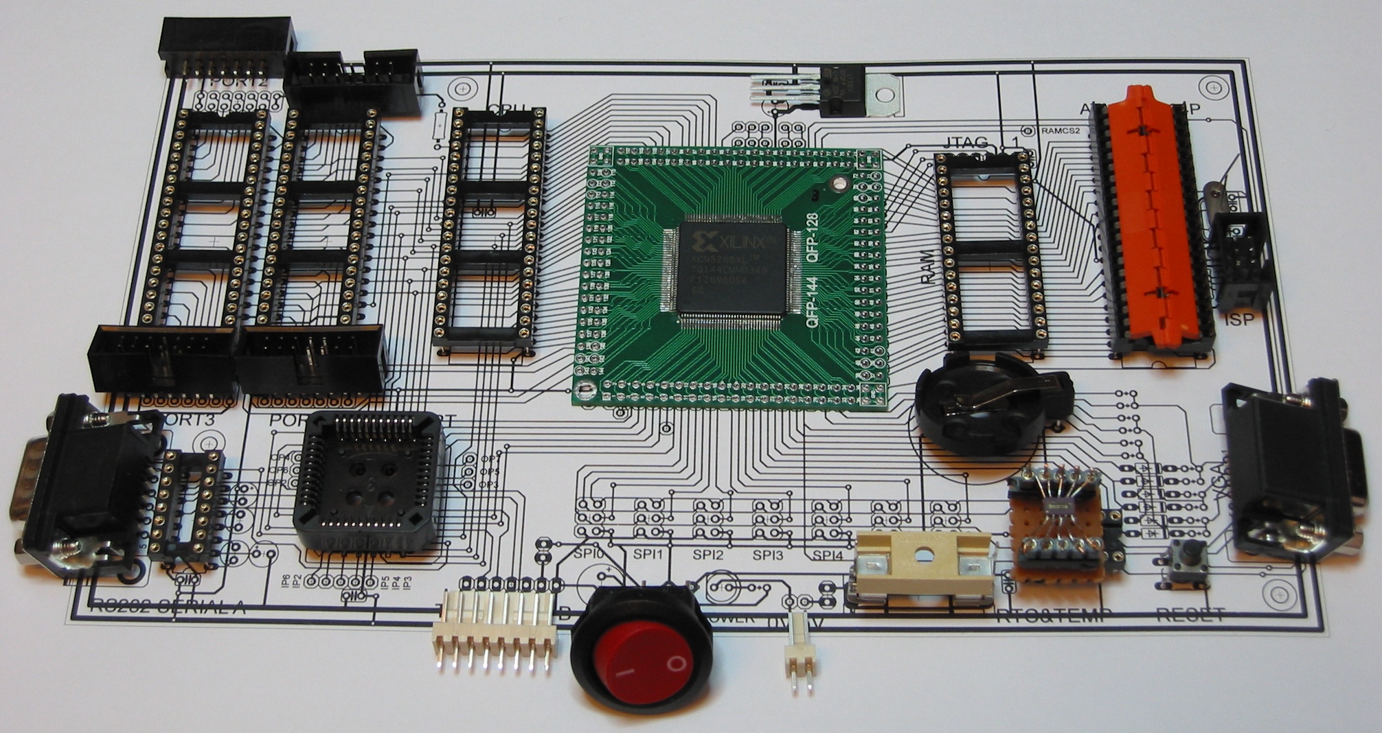 • All pins of the CPU and RAM are connected individually to the CPLD, a Xilinx XC95288XL 144 pin. The CPLD will also provide 65SPI and VGA.