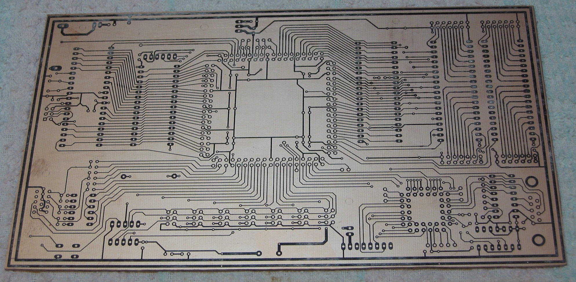 At this moment the PCB is etched and all holes are drilled. Next, I have to solder the vias by hand and check all traces.