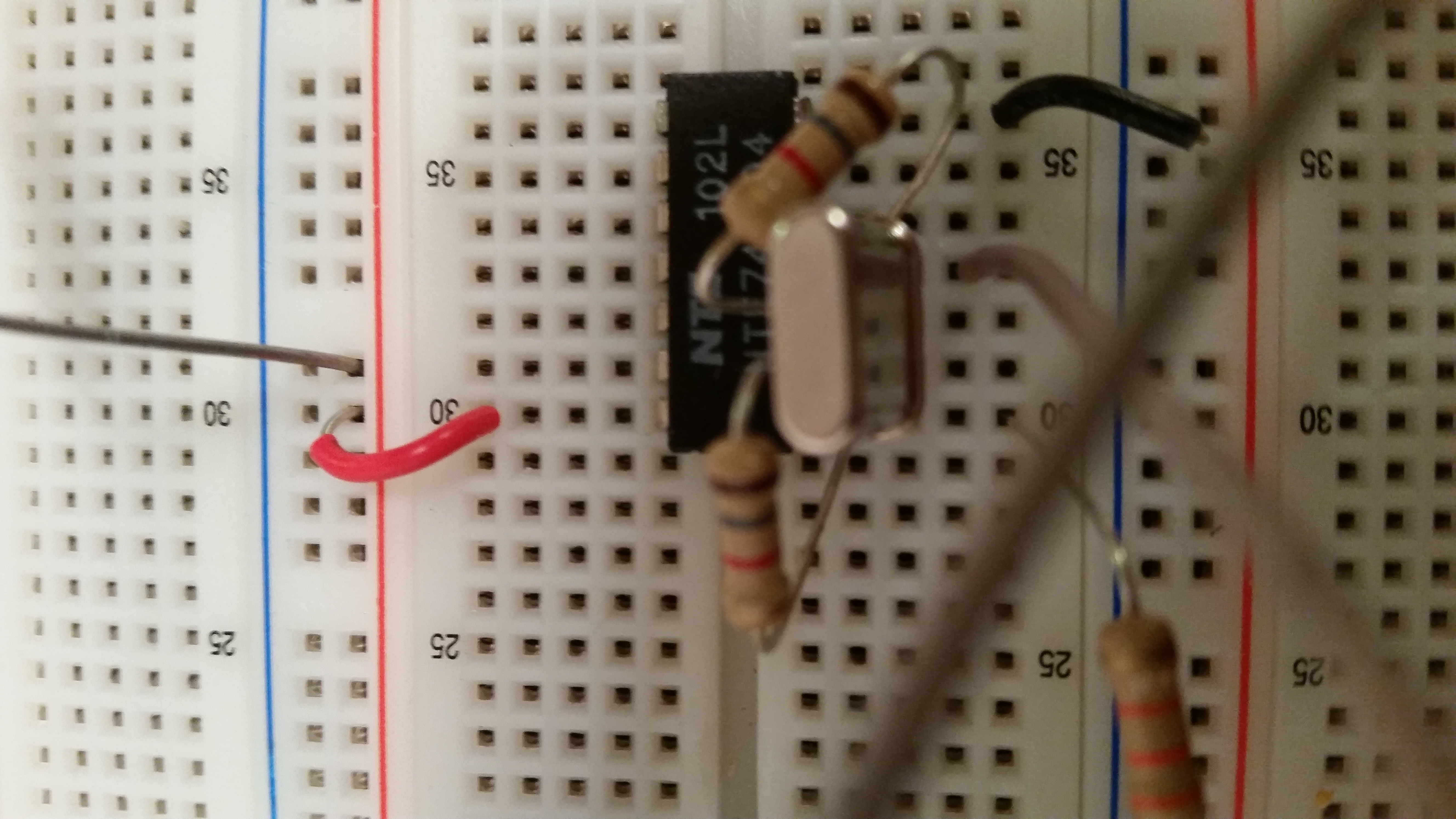 I have a 330ohm in series with the led. And 3.17k for NMI and IRQ. With a logic circuit I built on the top of the board I am not getting a clean high or low on 4 and 6. My clock signal should be clean, but I wont jave access to a scope until Dec 8th. Its clocked at 2MHz with a 7404 and a 1.8 across 1 and 2, 3 and 4, with the crystal going across 1 and 4. I have a 330k going from pin 1 to ground. For my reser I have a 2.7k on 40 to vcc, and a line going to my trigger, with a 10microF cap to ground, and othe side of the switch to ground.