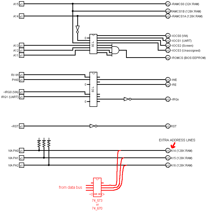 74_573 transparent latch doing basically the same job (as shown in red). Essentially you write the desired Bank number from the data bus to the VIA (or to the '573), and thereafter the bank number gets read out on pins which hardware interprets as the upper address bits when the program accesses the "window" at 8000-BFFF. This is a time-tested approach; solid and familiar territory.