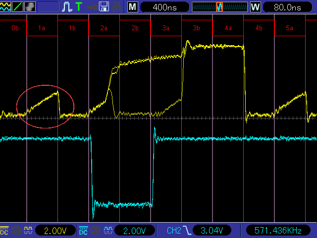 I put two arbitrary timing marks in the excerpt below, both of which seem to indicate the effect of Phase2 going high (and output drivers being enabled). But they are not separated by an integer number of cycles; there's also a roughly one-quarter-cycle phase shift. Apparently there's one output driver that responds promptly to Phase2 going high, and another which for some reason is very sluggish to do so -- at least that's one possible explanation.