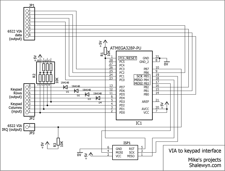 This was made around a keypad that I purchased on ebay. The keypad has the usual rows and columns matrix (4x4 keys consisting of 0-9 and A-F) and to which I've attached an Atmel ATMEGA 328P-PU microcontroller which does the scanning (thus taking the responsibility/work load from the 6502 / VIA).
