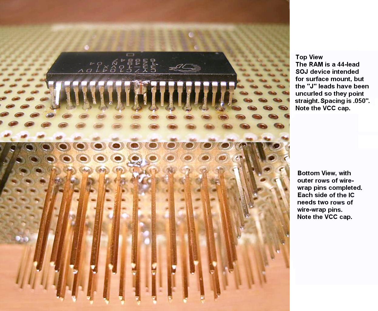 If your luck is bad, such a particle could lodge itself invisibly underneath the PLCC socket or some other component, and it would be impossible to detect and fix. I'm not a worrier by nature but I am uncomfortable with a power plane on the top (component side). The board in the photos is from Twin Industries, and they offer a double-sided power plane version as well. But I'll settle for a ground plane on the wiring side (bottom) only, where gravity isn't attracting debris, and where you have a better chance of seeing & correcting any trouble.