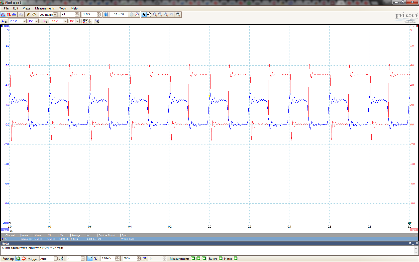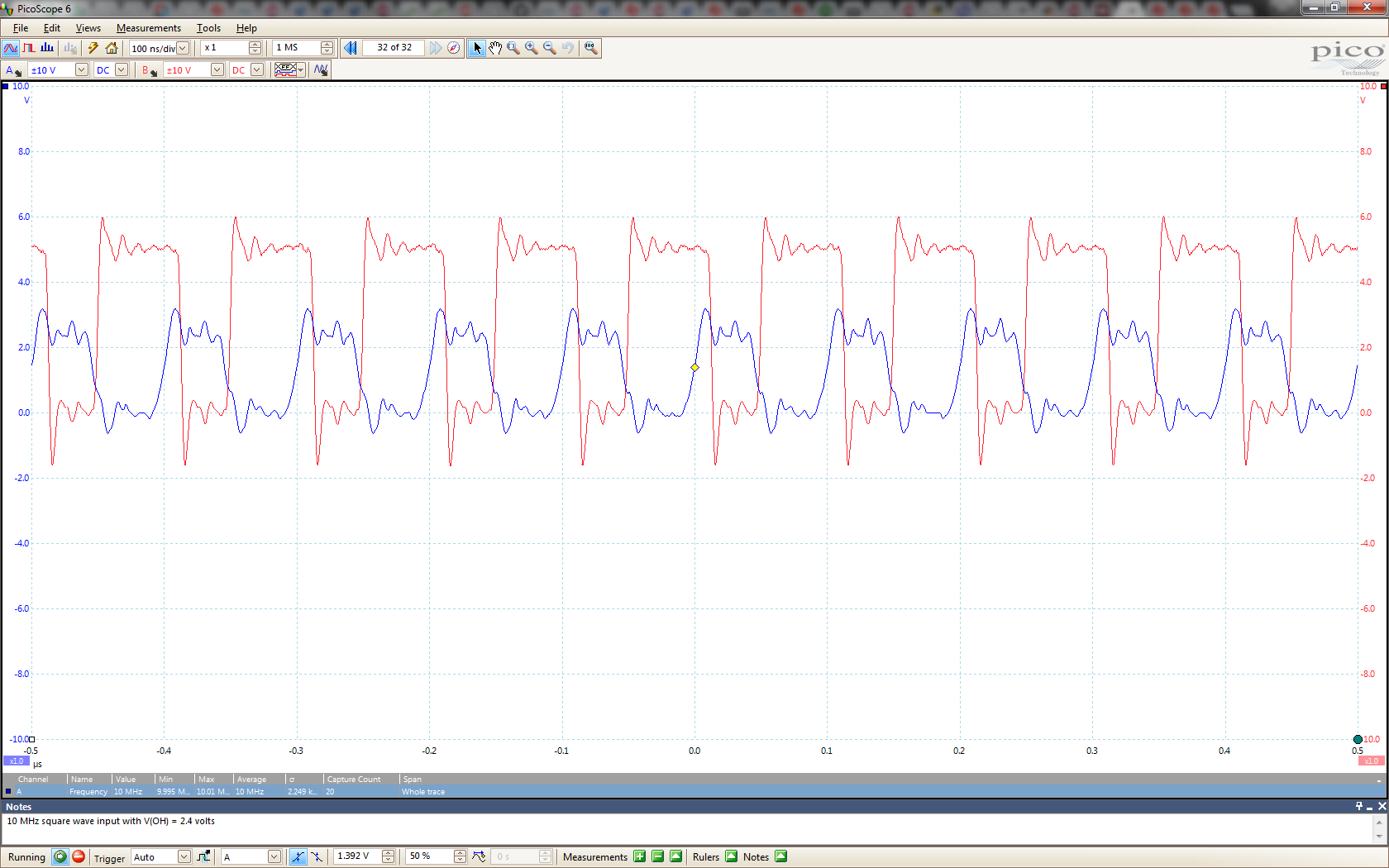 Taking this experiment further will involve a bit of additional circuitry. I could feed a higher frequency sine wave (3325A goes up to 20 MHz with sine wave output) into one of the HC00s other gates to square it up, then run that output through a 200-ohm pot and adjust it to 2.4 volts to drive the gate under test and probably get acceptable results.