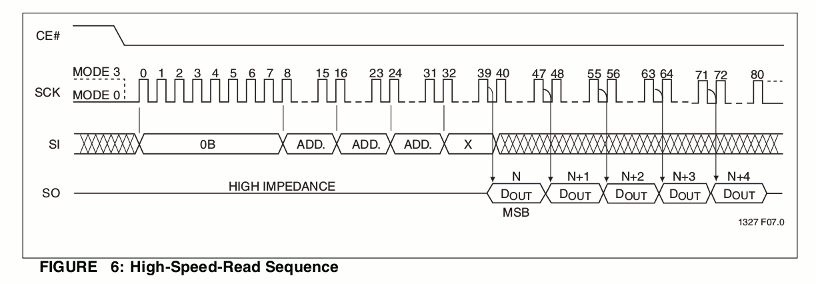 The qualifier was the word "serial." Here's the timing diagram to read from the 25VF032 4Mx8 serial (SPI) flash in an SO-8 package: