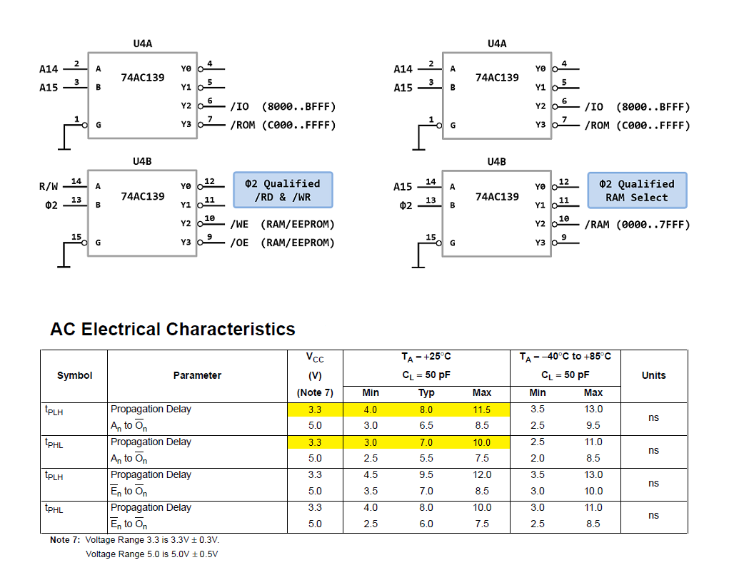 Hi Micheal, I would rather not use the '139 to create the PHI2 qualified signals as the '139 is rather slow compared to a 74AC00 and due to the very short data hold time provided by the W65C02 and the required data hold time of normal speed RAM (55ns or slower) this could violate the guaranteed times for writes