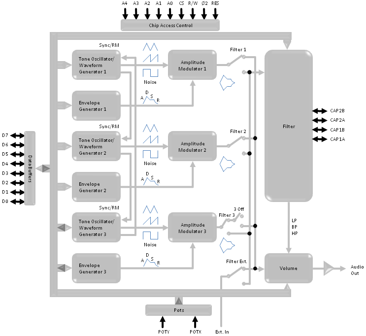 Ed and others here have some degree of expertise to offer, but you may have to explain some details about what the SID chip does before we can grasp how it's done (or how its behavior can be modeled). I did check the MOS Technology SID page on wikipedia, and the links there led me to the Block Diagram shown below (on http://www.waitingforfriday.com/index.p ... _Datasheet )