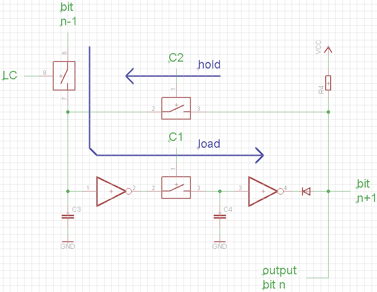 Each bit is formed by two inverters feeding each other through the gates c1 and c2, while the gate LC controls the shifting. The output from bits 0, 2, 5, 9, 11, 14, 18 and 20 is sent to the waveform selector. Here's the first two bits from the vectorized IC and the transistor scheme for a single bit: