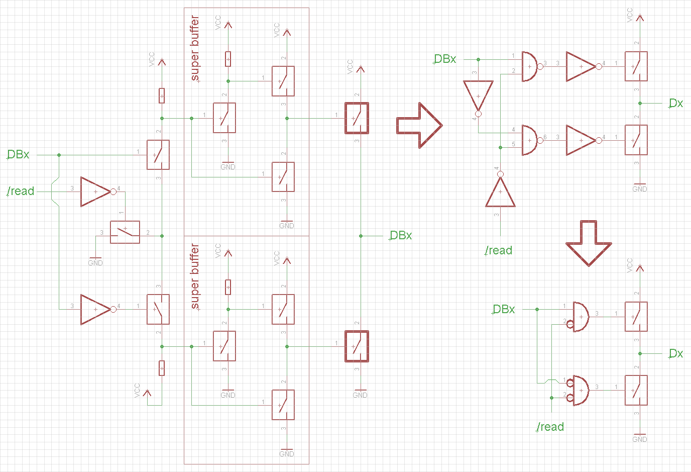 The circuitry which generates /read and /write also makes creative use of super buffers: