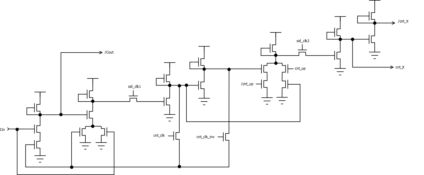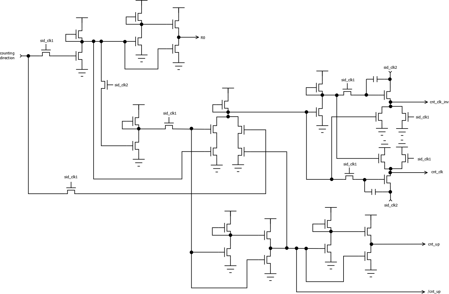 The cnt_clk and cnt_clk_inv signals are derived through an XOR gate, that checks when counting_direction has changed from the previous clock cycle, and two NOR ports, that make one of the signals active during the sid_clk2 phase based on the XOR output. The result is that cnt_clk_inv is high only the cycle after counting_direction has changed.