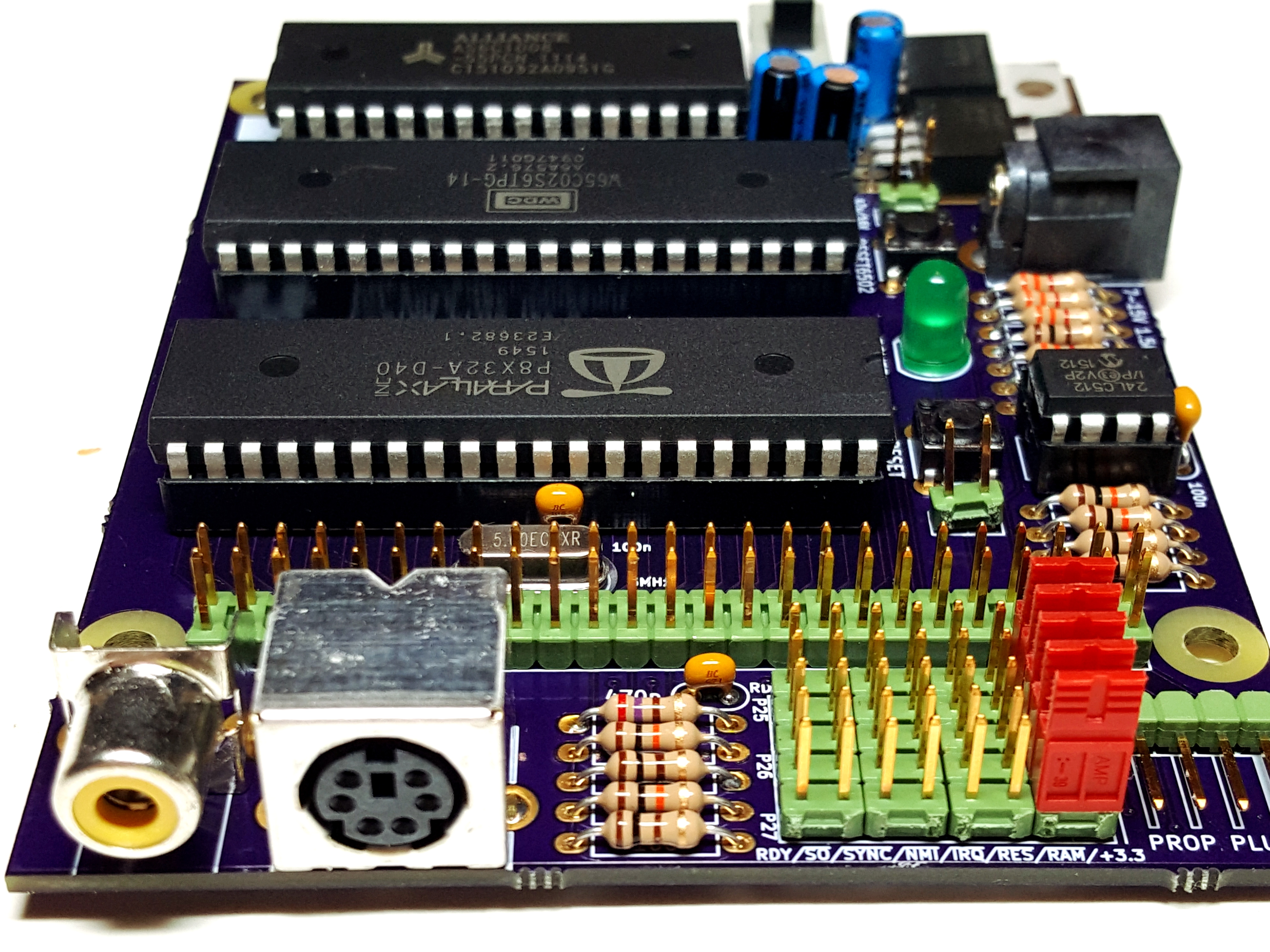 When I started out with the project, I used some extra chips to multiplex the data bus, address bus and control pins so I would have some pins left over. However, as it turns out, this caused some major headaches with programming. Long story short: I abandoned that idea and put the address bus and data bus straight onto the Propeller pins. This didn't leave many pins available but that can be solved with expansion boards. It's good enough to replicate an Apple 1 or a Superboard II (a.k.a. OSI Challenger C1P a.k.a. Compukit UK-101), and it should be enough for a PET/CBM or an Acorn Atom or others. I'm thinking of designing an expansion board with 7-segment displays and pushbuttons to make a KIM-1 or Elektor Junior replica.