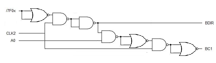 Also, the cascaded logic gates are making things worse. Cascaded logic results in long propagation delays and can result in a non-functioning circuit even though the logic appears to be correct.These delays are also why you were getting invalid pulses on BC1 - the A0 line was going high before the delays in the logic let BDIR go low and the result was an invalid pulse on BC1.