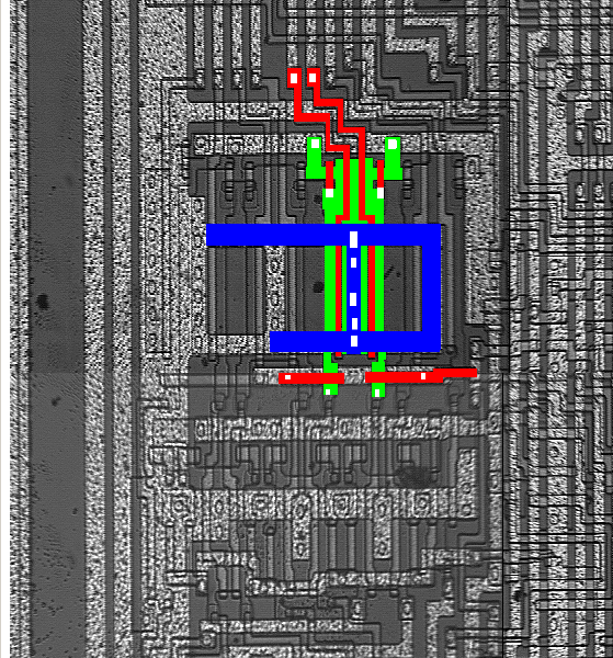 Now, does anybody know which sections are which? My best guesses are that the yellow area with 16 pads on it is the address buffer, the red area around the opposite edge is the data bus with some control lines, the green rectangle at the bottom is for some registers, the area at the top is the ALU with perhaps the accumulator register, and the area in the center is the control unit. I'm also guessing that the small three cyan rectangles on the right are the sequencer for the control unit, to provide up to eight cycles for an instruction.