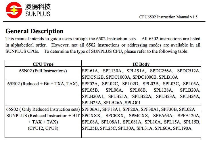 The CPU type 65N02 has two kinds of body, the one uses standard 6502 OP code, the other one uses Sunplus OP code