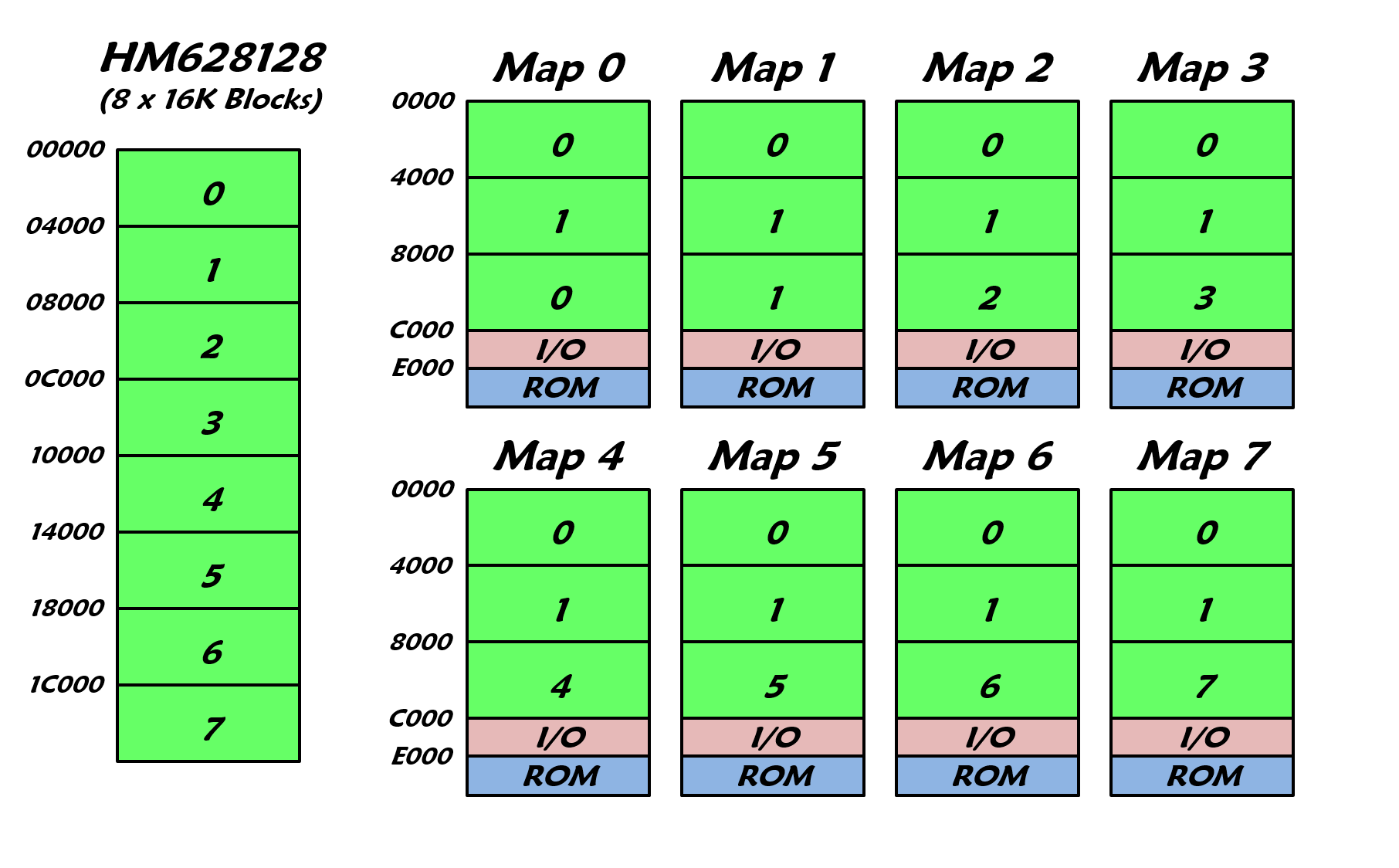 Was your original mapping with a single 128K RAM chip something like the diagram below, and now you're simply adding an additional 32K RAM chip and mapping it into address space at $0000-$7FFF unconditionally for each map?