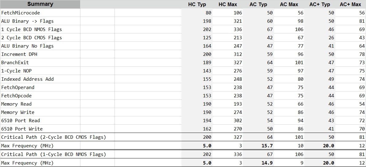 we think that OurCPU could (in theory) make 20MHz (when not using the "illegal" NMOS 6502 OpCodes).