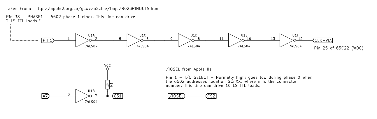 For the clock, I use PHI0 inverted 3 times to add a slight delay. I got that circuit idea from the Mockingboard clone by Bill Garber.