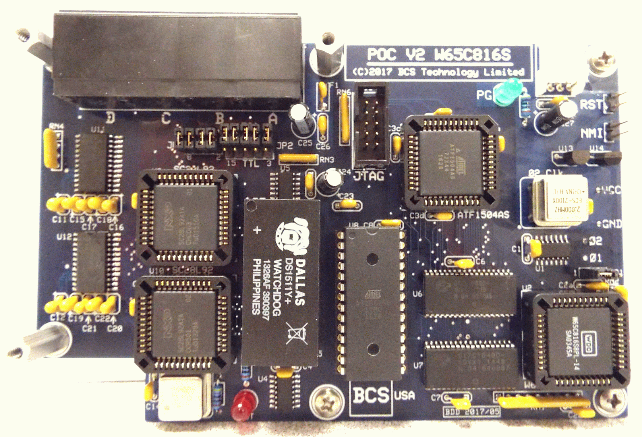 Installed active devices in the above photo are the two 512K SRAMs (near bottom right), two MAX-238 transceivers (left), a NAND gate being used as an inverter (near bottom left), the IRQ AND gate (immediately above the left hand DIP socket), the UARTs' X1 clock generator (bottom left) and the two Maxim DS1813 reset generators (right side above MPU socket), one of which is used to dampen the NMI circuit. I see a response when I manually negate each of the IRQ AND gate inputs, as well as the NMI circuit, so I'm good there.
