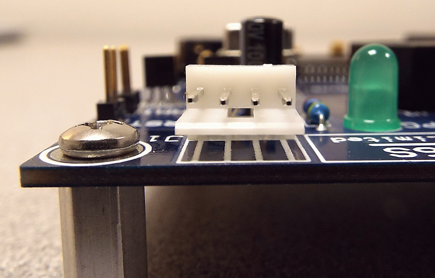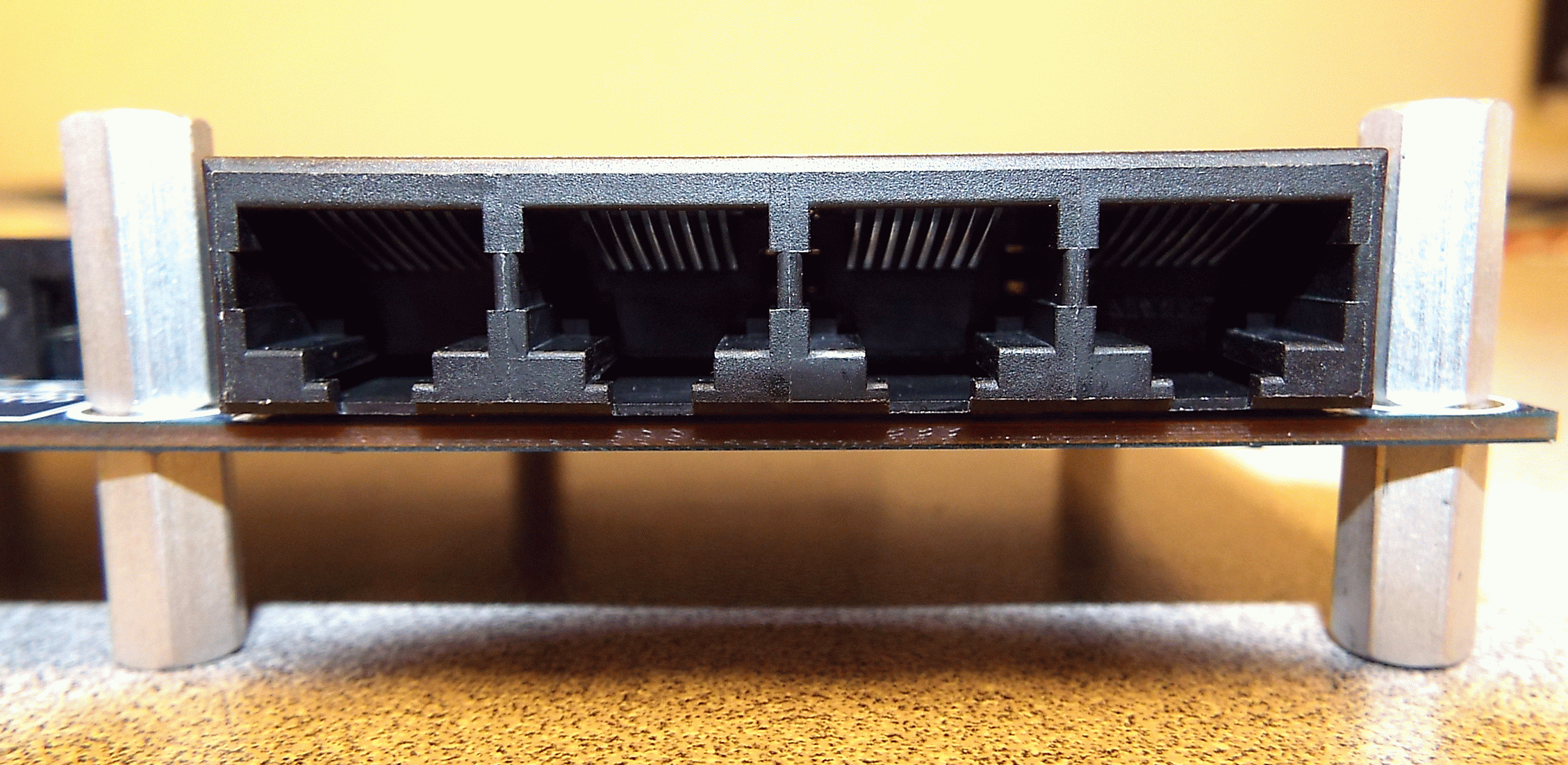 In the above photo, the partially completed unit is being checked for basic power distribution after undergoing an ohmmeter check for egregious faults. This was also a check for proper operation of the reset circuits. Proper voltages appear at all four serial ports, which means the two MAX-238 transceivers are alive and I correctly installed all the tantalum charge pump capacitors.