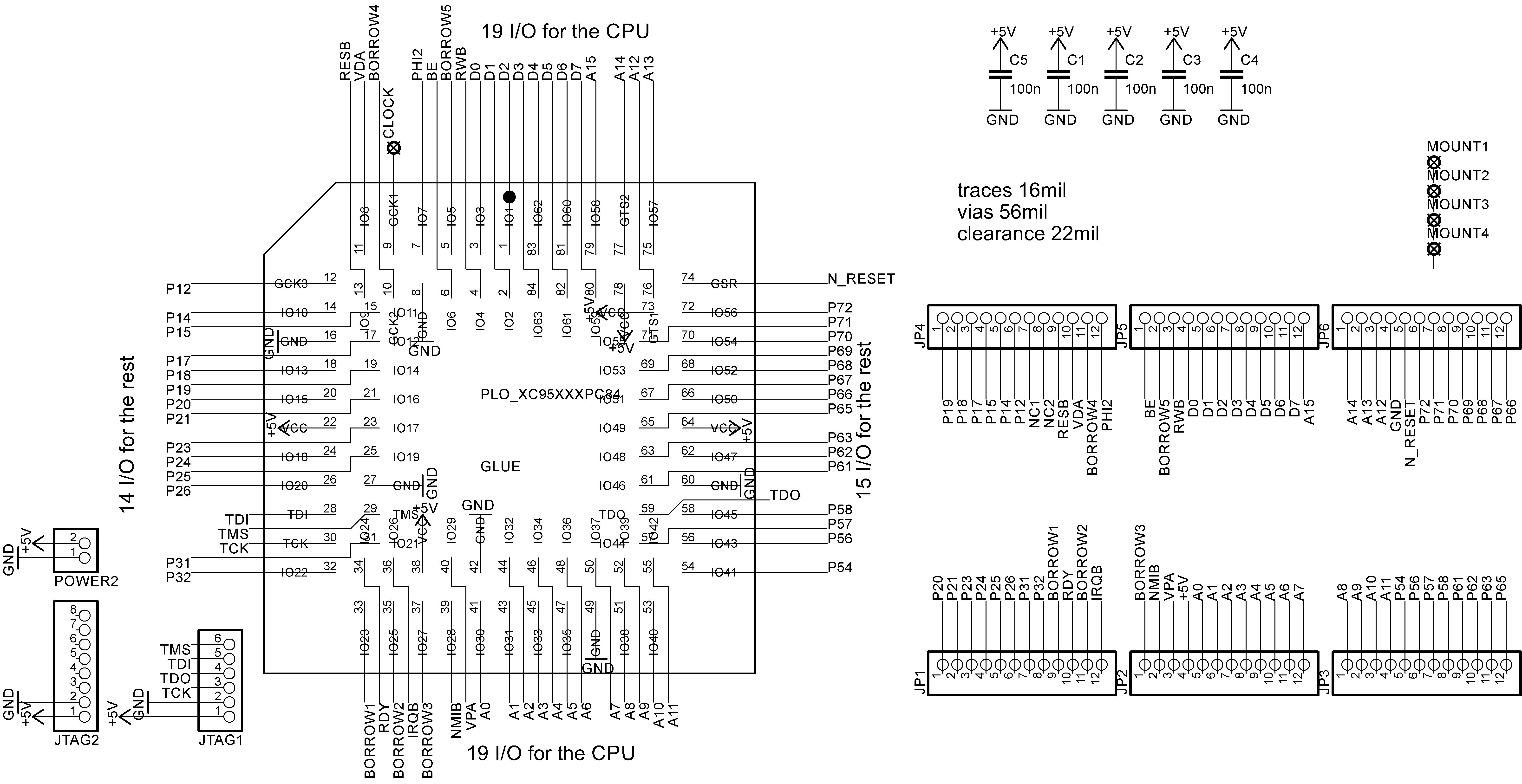 As glue logic I’m going to use the XC9572 PLCC84 or the XC95108 PLCC84 if I need more resources. This board is also very straight forward, all I/O pins of the CPLD are connected to the headers, except for the 16MHz clock input, which will come from another source. There are 72 pins in total on the headers, 68 of them are I/O. Two pins are N.C. and the remaining two are +5V and GND. By the way, each board will be connected with a separate power connector, which will provide a more evenly power distribution. A de-bounced reset signal N_RESET, also coming from another source, is added to the headers.