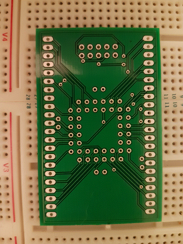 The PCB breaks the pins out from the PLCC socket to two 22 pin headers (pins 1 to 44) for testing purposes, routes all 4 VCC pins toegther and all 4 GND pins together and these route to the JTAG header.