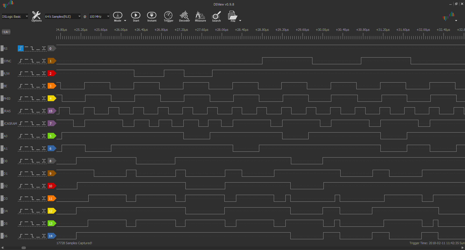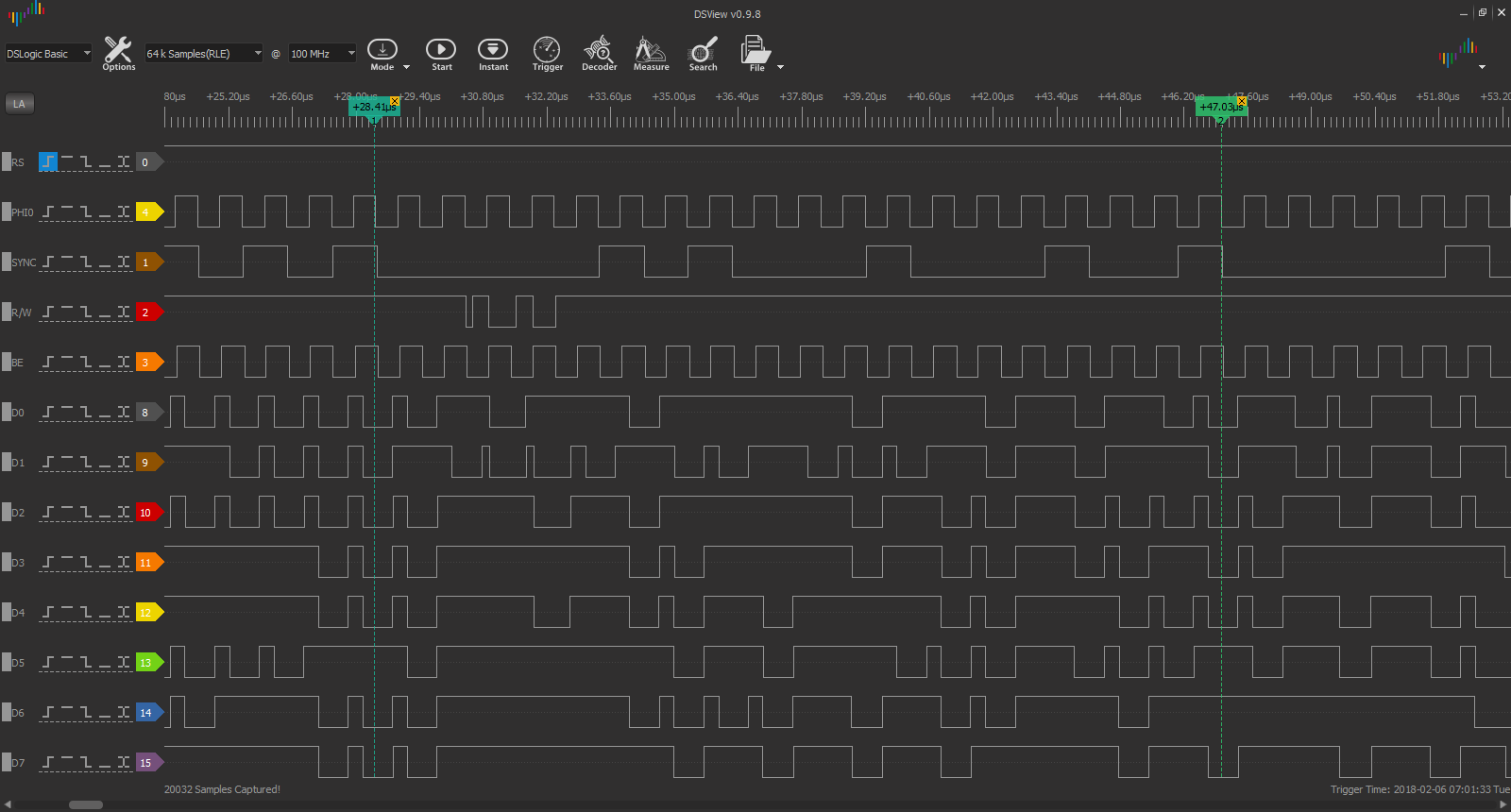 After confirming that all the pins on the 6510 pinout header were hooked up correctly and working, it was time to have a closer look. The analyzer showed PHI2 working nicely and lots of activity when /RS went high. I could see the CPU trigger the RESET sequence, but there was nothing on the address lines that looked like a fetch of the RESET vector.