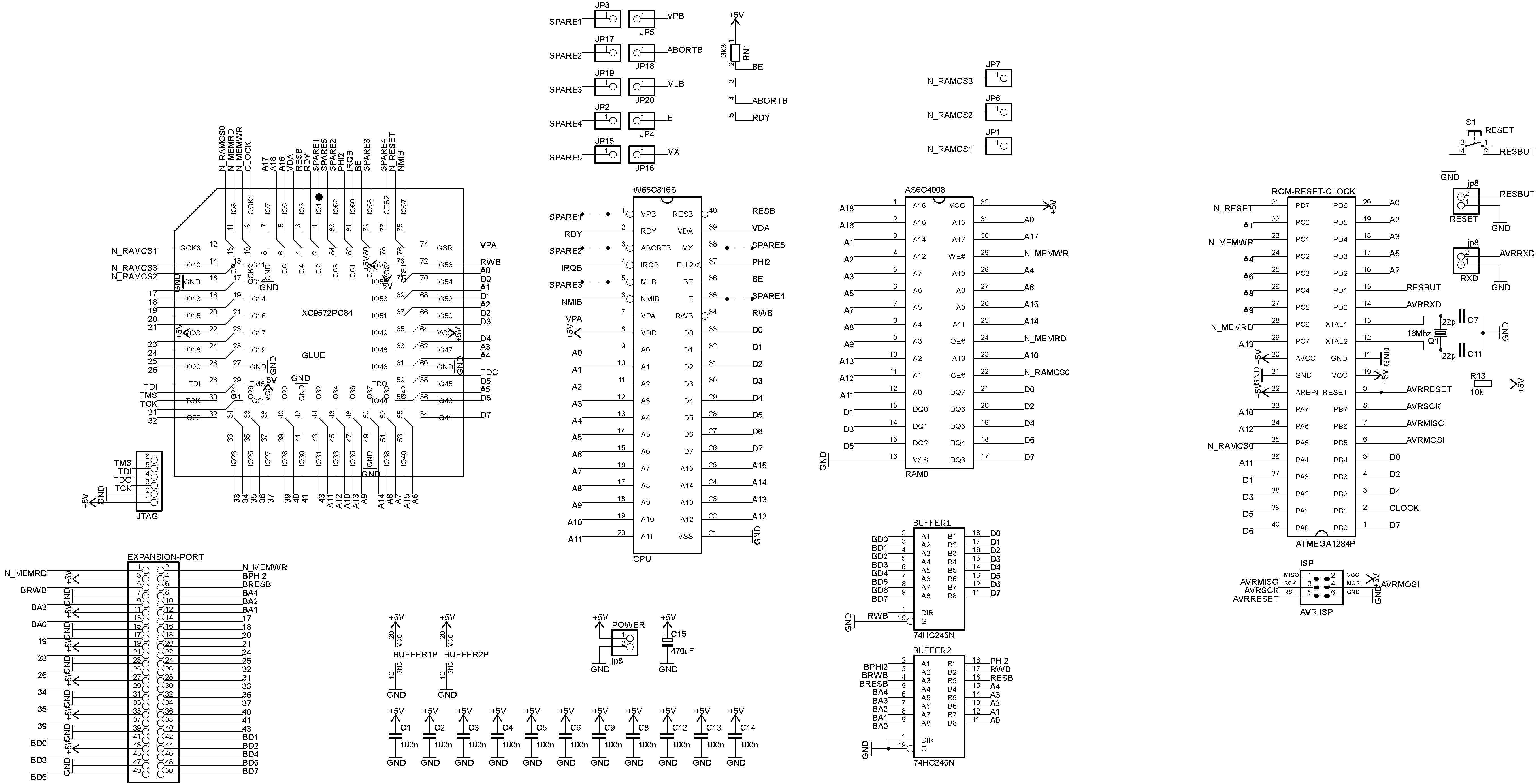 Is a 50 pin IDC header which connect CPU pins buffered through two 74HC245’s: BPHI2, BRWB, BRESB, BA0..BA4 and BD0..BD7. Also N_MEMWR and N_MEMRD are provided. All remaining unused CPLD pins which will serve as chip selects, IRQ inputs etc. for I/O devices. There are several remaining pins on the header which will be connected to GND and VCC. I hope these arrangements will be adequate for a decent expansion port and will result in better performance.