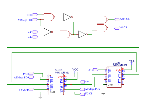I have modified the original address decoding a little to add a new input from the ATMega that will control through a NAND gate the I/O and RAM CS during the system boot.