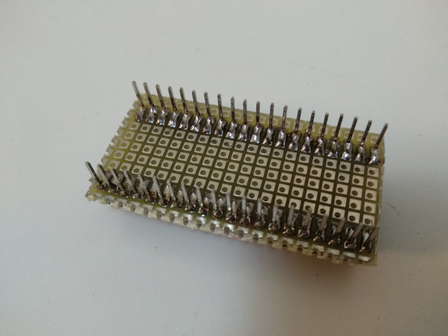 I pushed the male pins all the way so I can solder both the socket and pins on the same side of the perfboard and gain height to save the other IC.