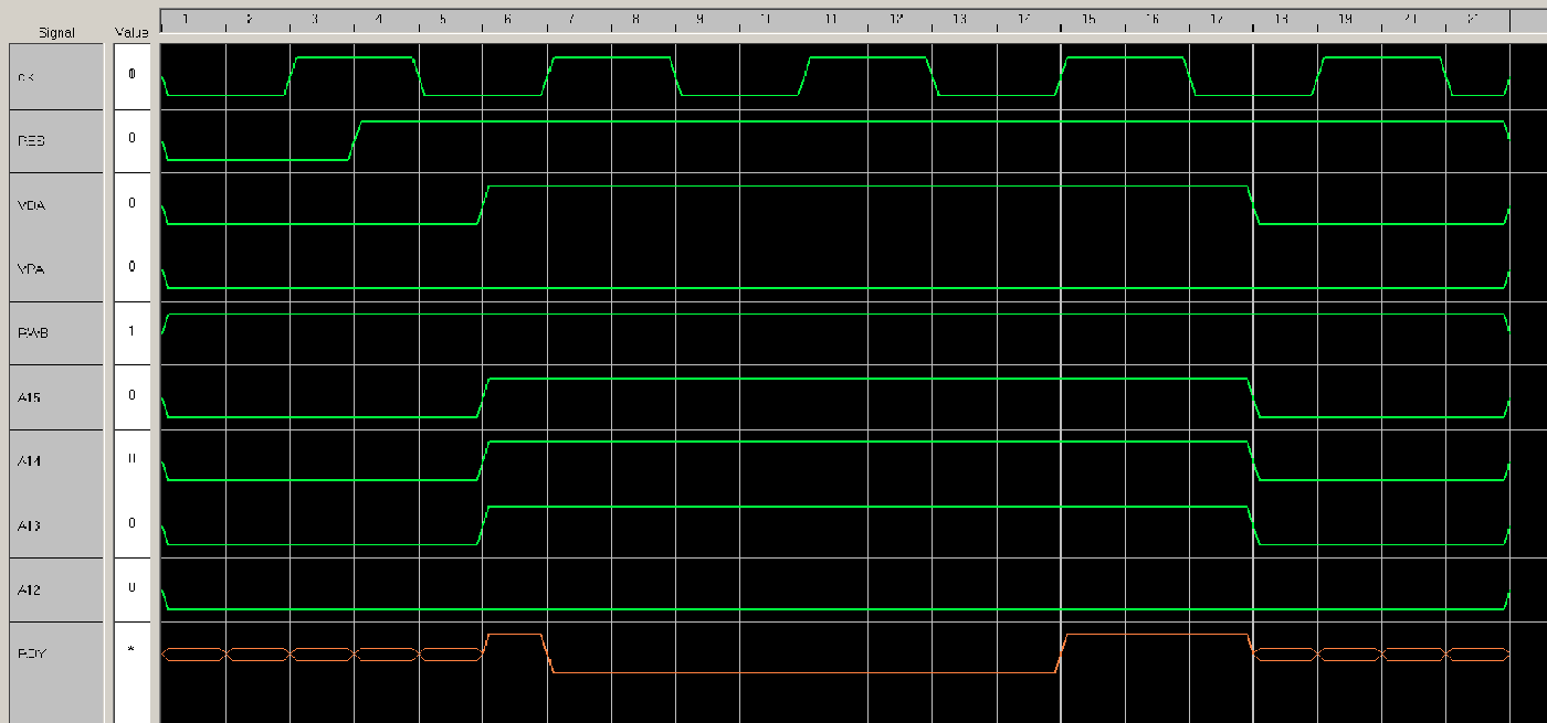 The above appears to be correct, but to my revised thinking, is not. The flaw in the logic would be at vector 18, which is when the wait-state period has come to an end. Although RDY (bottom of the graph) returns high at vector 15, the MPU doesn't actually restart until at vector 17, coinciding with the fall of Ø2. However, the logic's assumption at vector 18 is the event that required the wait state is over and the MPU has moved on to the next instruction. I don't believe this to be the case, which would mean the glue logic would no longer agree with what the MPU is up to.
