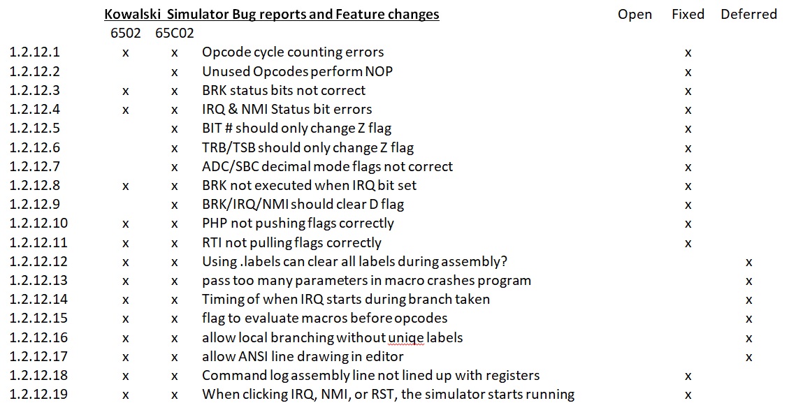 Here is a summary of the issues I have collected and their current status: It has passed both of Klaus' test suites - the 6502 and the 65C02. I has also passed the timing test that BigEd created (details here -> viewtopic.php?f=8&t=3340&p=38584&hilit=kowalski#p38581 )