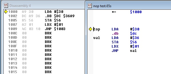 You can see in the disassembly window that the LDA #$36 at $1003 gets absorbed into $DB's operand. This trick allows you to call either top or val to load different values into address $56, in this example.