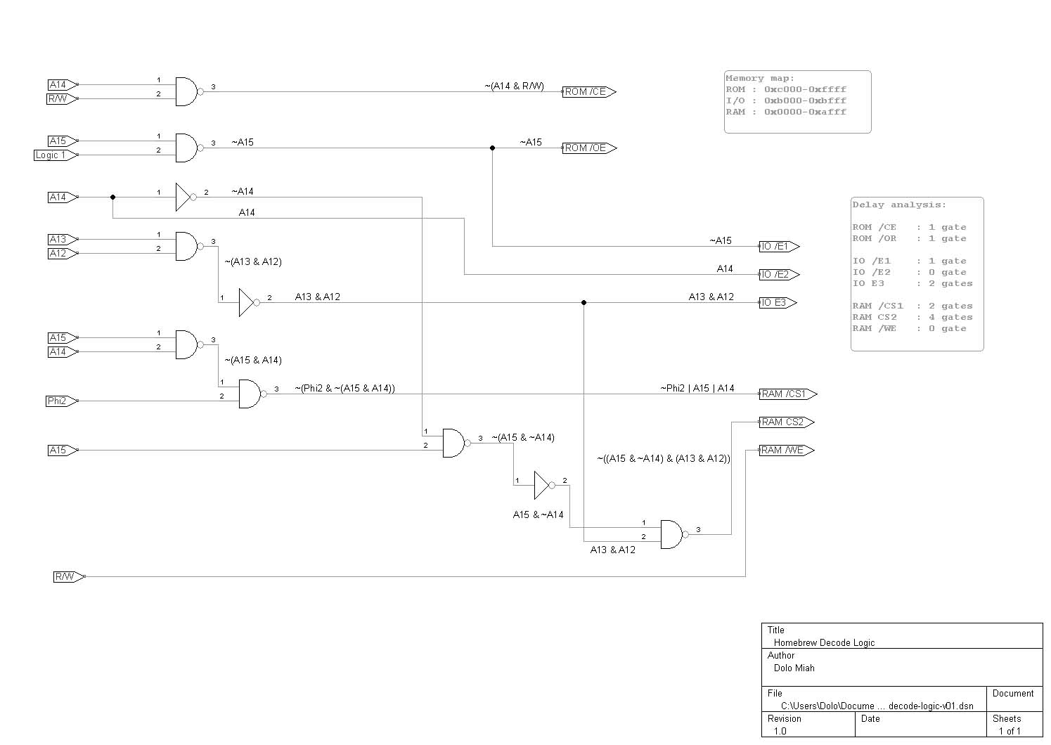 I hope I have transcribed this correctly, as I know it works of course. I have included a couple of notes re the memory map and how many gates propagation delay to come up with the decode. The maximum is 4 gates of delay, which I guess could be in the order of 28-36ns. Also see that Phi2 is not used to qualify ROM or IO activation, only for RAM access.