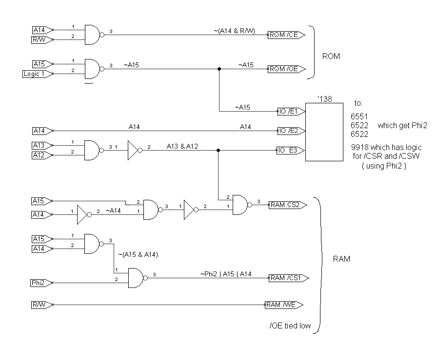 - @Chromatix - I did mention that I didn't think the logic was optimal, but the guidance that you and others give in terms of using address to qualify Chip Select and Phi2 with RWB to qualify Read-Write is a good one that I will look at. Without more clever parts than NAND and NOT, I haven't yet worked out how to minimise the number of gate delays. Four is a lot, and there may be nice ways to use the /CS1, CS2 with /E1, /E2 and E3 lines for RAM and 138 decoder - but I haven't figured it out yet. But might not be the problem of course..