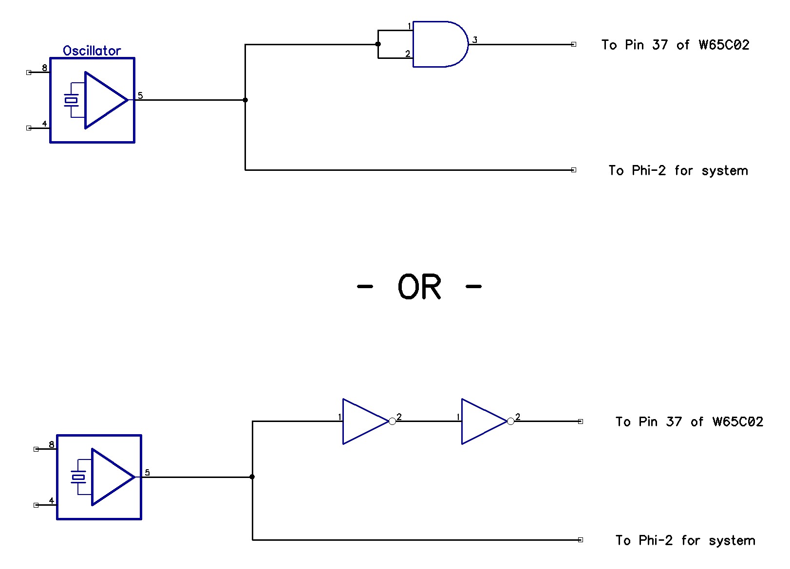 - Take the output of your oscillator and run that to everything that needs Phi-2 EXCEPT the CPU. (Don't use pin 39 as your Phi-2 for the system when using a W65C02)