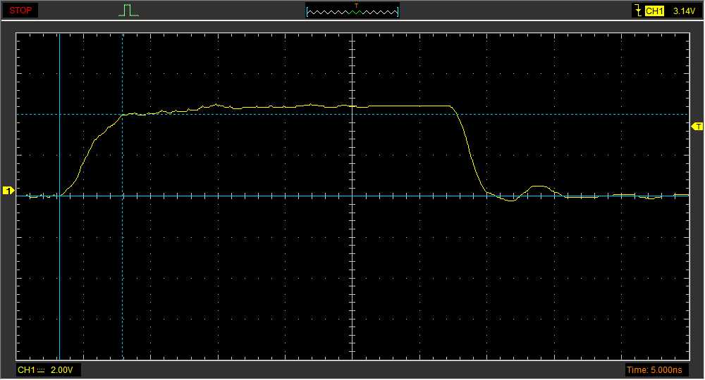 The below traces are the /OE signal in my recent project at 16MHz. This signal drives both the RAM and the ROM /OE and the line, with chips inserted, and scope probe attached measures at 55pF and 257K ohms, both measurements taken at 10KHz. We can see the following: