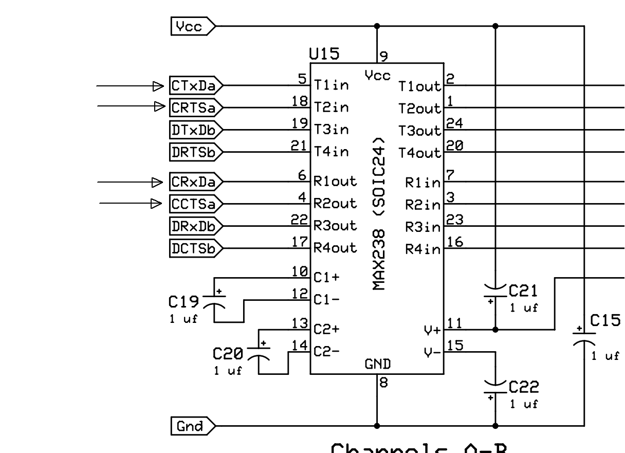 The console port on J2 (shown on the last page of the schematic) is rigged up so it can be operated at TIA-232 or TTL (actually, CMOS) voltage levels, depending on how the jumper blocks JP2 and JP3 (located on the same page as U15) are configured. The TIA-232 configuration is for use with a standard terminal or a thin client acting as a terminal. The TTL configuration is for testing a VT-100 terminal device I have yet to build.
