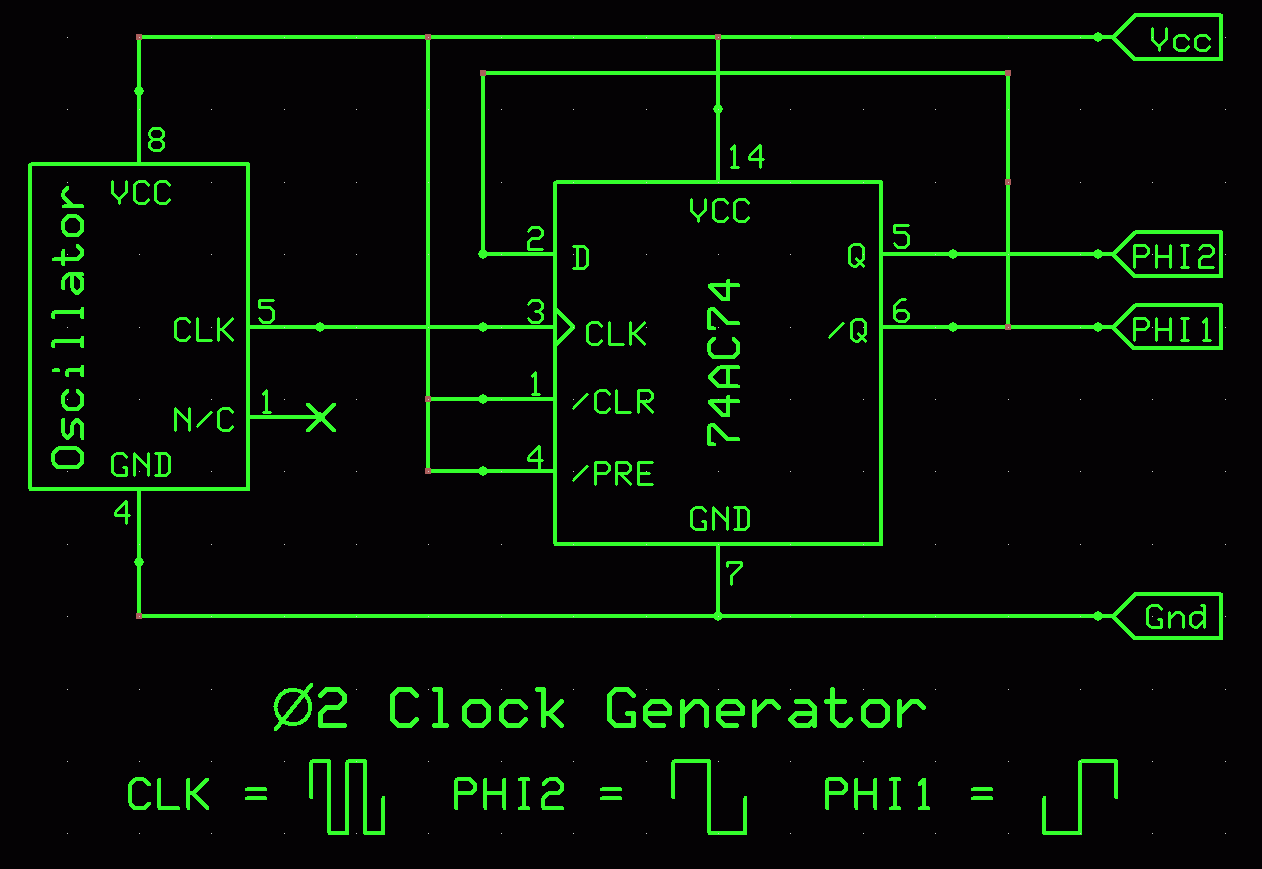 Naturally, solutions may give rise to new problems. Since it would be the CPLD that would make the determination when a wait-state is needed and how long it should be, it must have a continuously running clock input and most importantly, that clock must stay in sync and phase with the Ø2 clock when the latter is not halted. The unused second section of the flop can be used to produce the CPLD's clock, which is referred to as the GCLK.