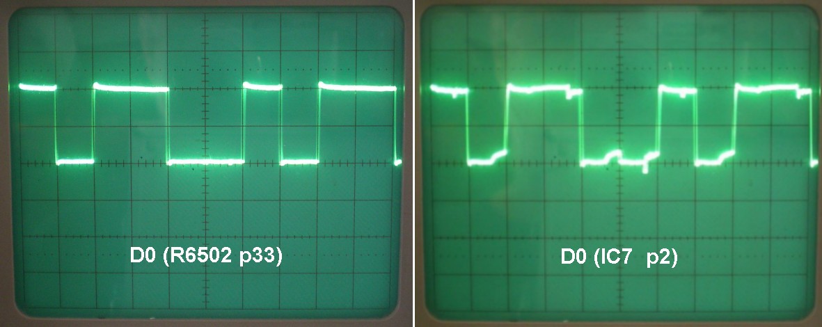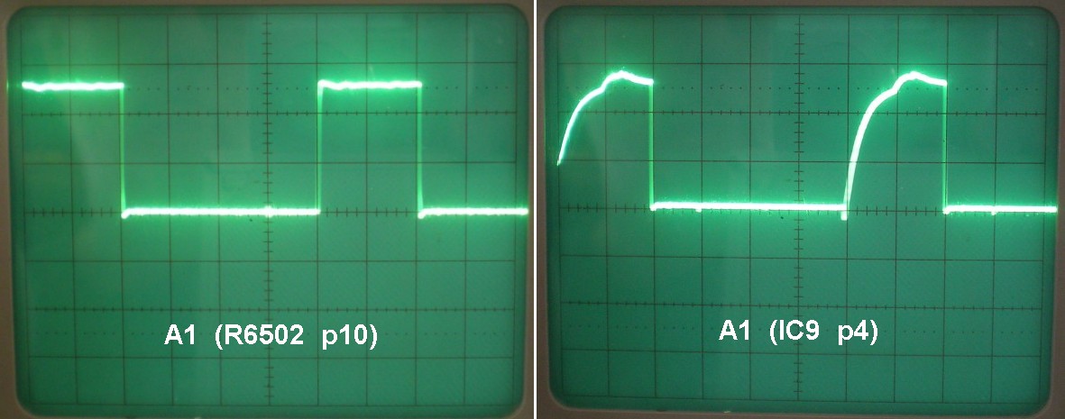 - About the buffers on the address bus outputs (IC8 & IC9) and the transceivers on the data bus ones (IC7), I did some oscilloscope photos to show you the signal of those busses before and after those stages. The distortion shown in A1 is the same in A0, A2, and the rest of active address busses.