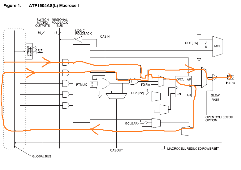 Yes, I did have a theory running around my head that the output multiplexor might require things to loop back through, using up a few more macrocells. However, the ATF1504 datasheet, figure 1, shows the macrocell diagram. It includes - as i'm reading it - the ability to have both a path from the MUX to the I/O Pin and to the Latch, but also from the Latch to the I/O pin and feedback into the interconnect array. So, unless there's a restriction on these combinations, it seems to me that theoretically you could have a setup whereby the Latch feeds back into the matrix, which goes into the MUX, which implements the multiplexor, which then bypasses the Latch out to the I/O pin. Hence, only one macrocell is used.